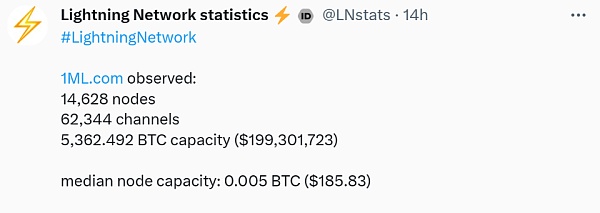 当前闪电网络节点超14000,通道数超60000,网络中总容量超过5000BTC。