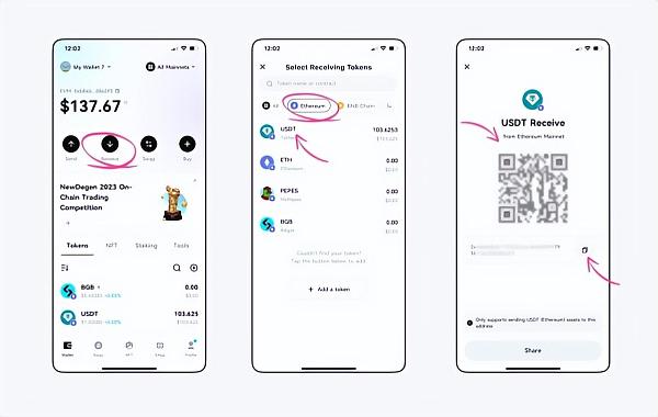 在 Bitget Wallet 上创建 MPC 钱包后,请按照下面的步骤从其他钱包或交易所向 MPC 钱包中存入资产。在转账前,请仔细检查钱包地址和网络兼容性。