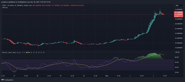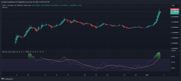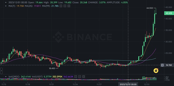 在过去30天里,ORDI代币的价格迅速上涨了500%,主要原因是其最近在知名的加密货币交易所币安上市。这次上市被定位为新兴项目中的“种子”标签,不仅提高了其知名度,还激发了投资者的信心和兴趣。