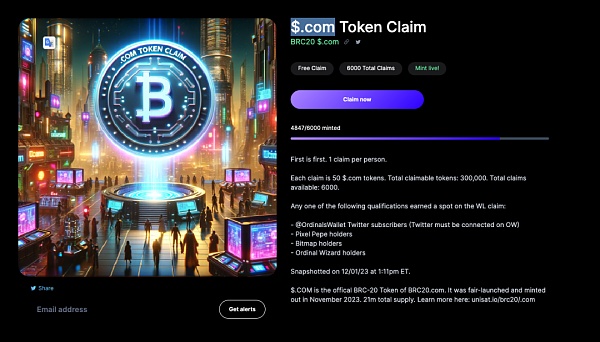 Ordinals Wallet:30万枚$.com代币可供用户申领