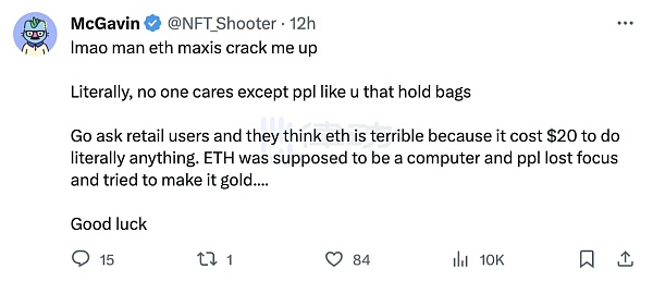 社区开发者 McGavin(@NFT_Shooter)指出:「去问零售用户,他们认为 ETH 很糟糕,因为做任何事都要花费 20 美元。ETH 应该是一台计算机,人们失去了注意力并试图将其变成黄金。」
