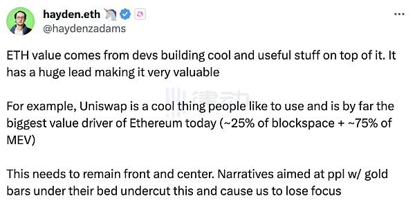Uniswap 创始人 hayden adams(@haydenzadams)认为,ETH 的价值来自于开发者在其基础上构建酷炫且有用的东西。它具有巨大的领先优势,因此非常有价值。他还以 Uniswap 为例,表示「Uniswap 是人们喜欢使用的一个很酷的东西,并且是迄今为止以太坊最大的价值驱动因素(约 25% 的区块空间 + 约 75% 的 MEV)」。