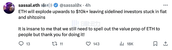 EthHub 联创 sassal.eth(@sassal0x)认为,ETH 将飙升至 1 万美元以上,让观望的投资者陷入法定货币和垃圾币的困境:「我们仍然需要向人们阐明 ETH 的价值支撑。」