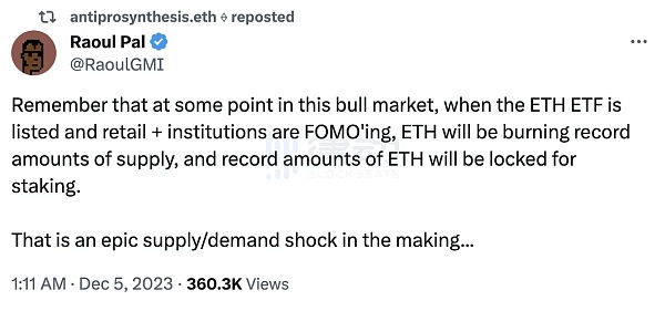 高盛前高管、宏观研究机构 real vision 创始人 Raoul Pal(@RaoulGMI)也发文表示:「请记住,在这个牛市的某个时刻,当 ETH 的 ETF 上市并且散户和机构都害怕错过机会时,ETH 将燃烧创纪录的供应量,并且创纪录的 ETH 数量将被锁定用于质押。」