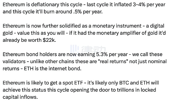Ryan 其余观点包括以太坊债券持有者现在每年赚取 5.3%、以太坊很可能会获得现货 ETF,以及以太坊现在是完全的 POS,能够做到不消耗能量来产生区块空间——「对于传统 ESG 投资者来说,以太坊 ETF 将是本周期唯一勾选的项目」。