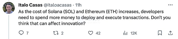Iron Forge Cloud 的 CEO Italo Casas(@italoacasas)表示:「随着 Solana (SOL) 和以太坊 (ETH) 成本的增加,开发者需要花费更多的钱来部署和执行交易。您不认为这会影响创新吗?」