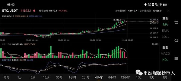 围绕比特币BTC41400-41600附近进场做多,目标在42400附近止盈出局。操作建议最多使用二十分之一的仓位进行操作。