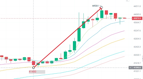 在43500-43700附近多单,设置300的防守位,目标为44500-45000。
