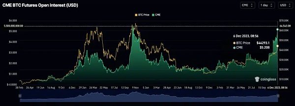 比特币在 CME 的 OI 已升至 52 亿美元,仅比 2021 年 10 月单个 BTC 价格接近 69,000 美元时的 ATH 低 2 亿美元。最近 OI 的飙升与比特币在过去几个月上涨 26% 的速度一致,目前该加密货币的价格略低于 44,000 美元。