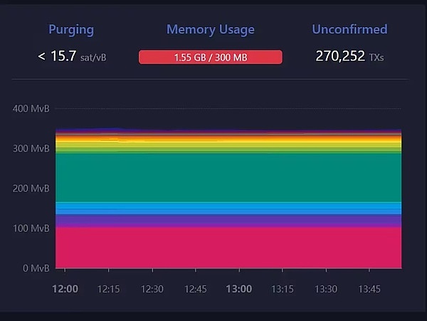 链上数据显示,比特币区块链上有超过26万笔未经确认的交易,这反过来又推高了完成交易的价格。 由于与常规交易相比,铭文交易的大小更大,内存使用量也飙升至超过 300MB。