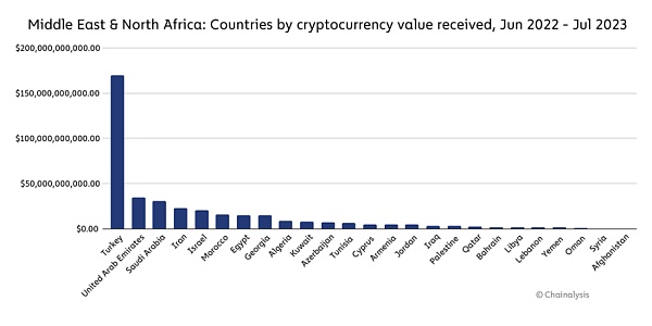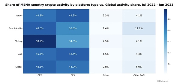 不同国家之间存在显著差异,参考下面的热力图,该图按平台类型比较了中东和北非地区一些顶级加密经济体去年的活动。