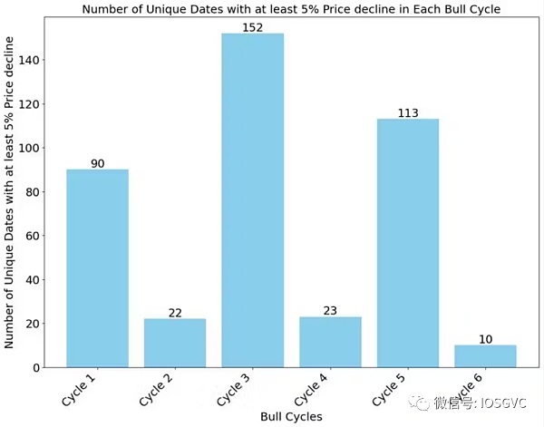 在比特币走向顶峰的过程中,上一轮周期经历了近 115 次 5%或以上的每日修正(这里我们将负收益称为修正),而本轮周期只经历了 10 次这样的修正。即使是持续时间较短的周期,其修正次数也多于本轮周期。