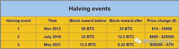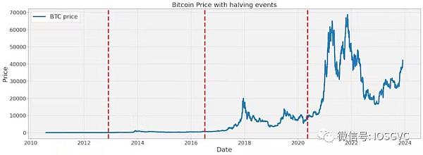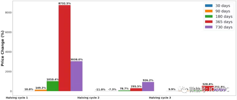 这些周期清晰可见,似乎与减半事件有关,从下图中可以清楚地看到减半事件后 BTC 价格的变化: