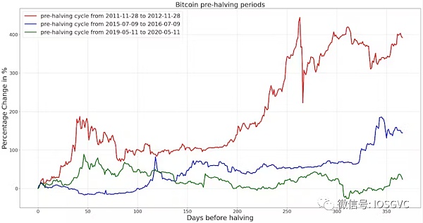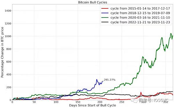 当前的牛市周期持续一年左右。下面我们将在类似的时间窗口内,将比特币在本轮周期与前几个周期的回报率进行对比。