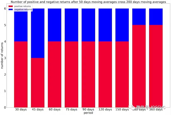 纵观比特币价格的整个历史上,50天 MA 仅在6个实例中跨越了200天 MA。从概率上讲,可以预测超过80%的可能性(历史上6次事件中的5次),在交叉发生的一年后会有正收益回报。