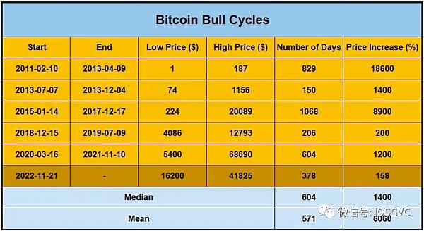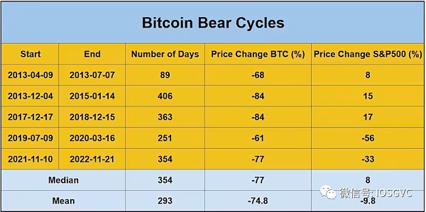 分析过去的周期,以前熊市周期的中位数跌幅为-77%(平均跌幅约为-75%)。最近的熊市周期正好下跌了77%。另一方面,牛市周期的中位数价格增幅为15倍(平均增幅约为60倍)。