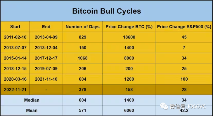 对于当前的牛市周期,比特币价格从底部起算增长了2.6倍,时间上大致处于中等持续时间牛市周期的中间。