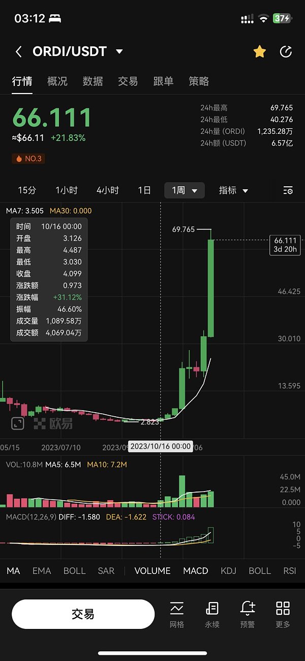 从0.02开始拉了将近2个月到0.48,涨幅24倍 $ordi 同样从3拉到当前最高69,涨幅23倍 可能你会觉得 $ordi 是比特币生态,是公平发射,是牛市发动机; 但经历过上半年的都记得,香港概念当时也被看作是新一轮牛市资金的重要来源