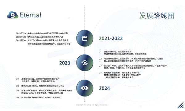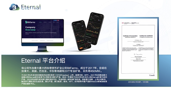 据悉,Eternal作为一家专注加密算力期权的综合型服务平台,不仅拥有BTC期权及衍生品交易、算力产品、算力租赁、借贷、NFT等多元化的Web3.0生态,同时还背靠加拿大最大的加密货币矿业公司Bitfarms Ltd ,由其全资控股,拥有着强大的资金实力以及行业优势。早在,2021年8月,Bitfarms Ltd 收购加拿大金融公司Eternal成立全资子公司研发云算力产品力期权综合平台。