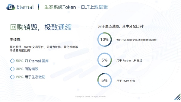 此外,对于平台币来说,供给端一方面是市场中流入的平台币的数量、币种价格表现、市值等这些数据,还包括最重要的一部分:通证销毁机制。因为平台通过手续费盈利,利用盈利来对平台币进行回购销毁,进一步缩减了市场中的流通量,从而增加了平台币的价值。显然,Eternal在这方面做得较为成功,还可以在多个应用场景流通,并且借贷、质押挖矿、各种场景算力租赁、SWAP交易平台、云算力矿机、量化策略等 产生的手续费,其中30%的手续费用于回购销毁,极大降低ELT的流量。