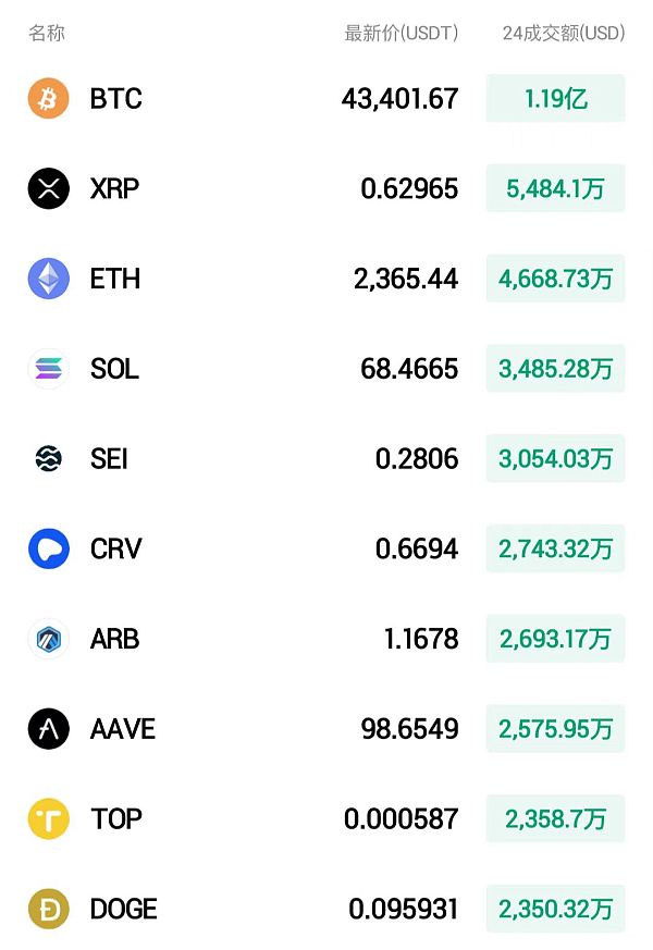 在市场概览方面,比特币今日稍跌0.43%,最高报44229美元,最低报42868美元,波动率为3.17%。而以太坊今日表现强于比特币,上涨1.87%,创下18个月以来新高,在2380美元左右波动,波动率为4.05%。主流币中,SOL表现最佳,上涨9.68%,现报69.12美元。总的来说,加密货币总市值为1.68万亿美元,较昨日上涨0.9%,全网24小时成交量为969亿美元,略有下滑。