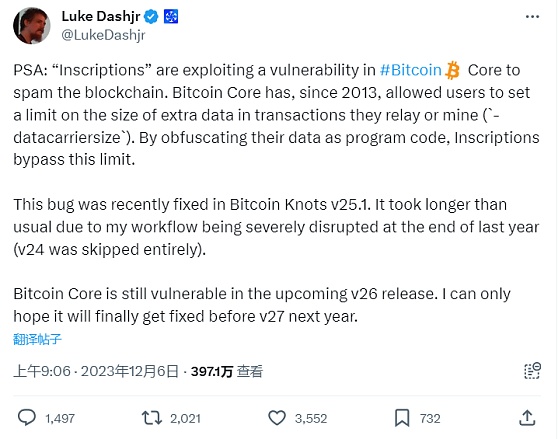 Luke Dashjr 表示,自 2013 年以来,Bitcoin Core 允许用户对他们中继或挖掘的交易中的额外数据大小设置限制。通过将数据混淆为程序代码,铭文绕过了这一限制。Luke Dashjr 希望在明年的 v27 版本发布之前能够最终修复。