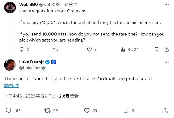 Luke Dashjr 回复称,首先不存在这样的事情。 Ordinals 只是一个骗局。