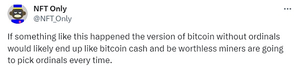 @NFT Only 表示,如果发生这样的事情,没有 ordinals 的比特币版本可能会像比特币现金一样最终变得毫无价值,矿工都会选择 ordinals。
