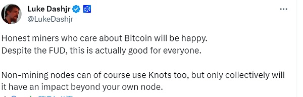 对于矿工的选择问题,Luke Dashjr 回应称,关心比特币的矿工会很高兴。 尽管存在 FUD,但这实际上对每个人都有好处。