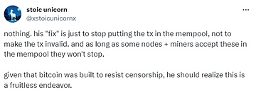 @stoic unicorn 表示,没有什么,他的「修复」只是停止将交易放入内存池,而不是使交易无效。只要一些节点 + 矿工在内存池中接受这些,他们就不会停止。鉴于比特币是为了抵抗审查制度而建立的,他应该意识到这是徒劳的努力。