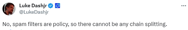 对此,Luke Dashjr 回应称,垃圾邮件过滤器是政策,所以并不会有任何分叉。