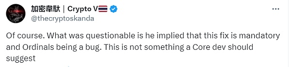 加密韦驮| Crypto V 表示,他暗示此修复是强制性的,这不是核心开发者应该建议的。在这里看不到中本聪的愿景,看到的只是一个开发者试图将自己病态价值观置于中本聪和周围警察最初的共识之上。在此之后,你怎么还能称比特币为最去中心化的货币呢?
