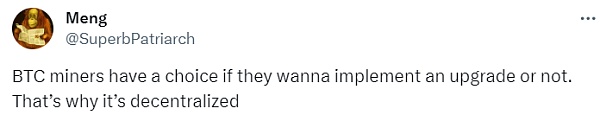 @Meng 调侃道,比特币矿工可以选择是否实施升级,这就是为什么它是去中心化的。