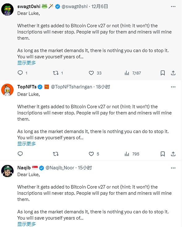 在评论区,很多人转发了同一条回复,「无论它是否被添加到 Bitcoin Core v27 中(提示:不会),铭文永远不会停止。人们将为它们付费,矿工将开采它们。 只要市场需要,你就没有办法阻止。接受这个现实,你的未来才不会在沮丧中度过。」