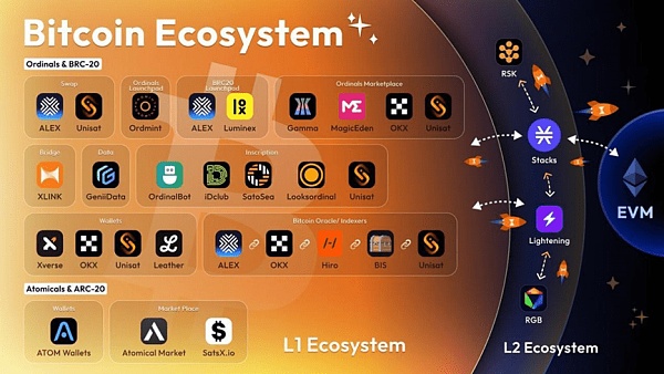尽管从历史沿革来看,目前BTC市场行情尚未达到2021年11月创下的6.9 万美元的市值高点,但毋庸置疑的是,相比2021年,Bitcoin生态的许多项目和技术都找到了新的突破口,正在释放着新的生命力。