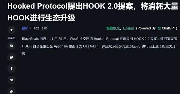 11月29日,Web3社交网络Hooked Protocol提出了HOOK 2.0提案,表示HOOK将作为Gas代币在生态AppChain中发挥更多作用,实现链上生态的重大升级。