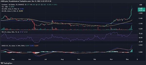 最近,卡尔达诺(ADA)在市场上呈现出持续上升的态势,不断创造历史新高。根据 Santiment 的最新数据,自2022年6月以来,ADA从未达到过这样的价格水平。而相对强弱指数(RSI)显示ADA接近90,这意味着它正经历着一个重要时期内最强劲的上涨趋势,同时也暗示着可能的价格调整。