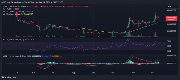 尽管如此,与狗狗币类似,Floki Inu仍保持着看涨趋势。相对强弱指数(RSI)高于60%,表明看涨势头强劲。