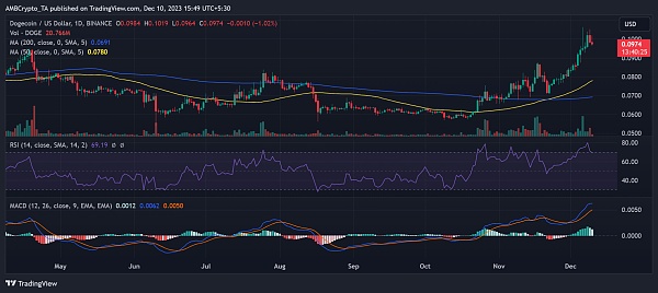 在过去的7天里,狗狗币的价格上涨了约15%。过去三天的日线图显示出明显的价格波动,狗狗币在两次每日价值飙升中均超过了6%,最近一次上涨发生在12月8日,上涨了6.24%,将价格推至0.10美元。