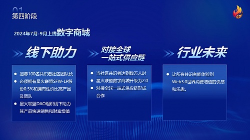 StarFire Alliance Web3.0还计划开发数字商城,在全球范围内提供一站式供应链服务,并为共识者提供消费增值的机会。数字商城的利润将分配给产品供应商和SFW-LP持有者,同时构建去中心化银行流动性。共识者通过参与商城活动和奖励机制,获得USDD代币,可以在去中心化银行变现或参与增值计划。