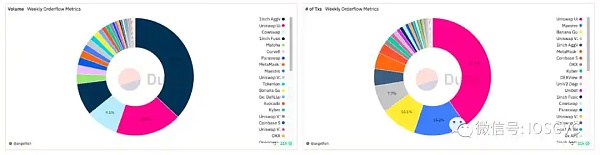 Angelfish 的 Dashboard 中显示,主要订单流仍然来自 DEX,例如 1inch 和 Uniswap。值得一提的是,例如 Metamask Swap 和 Tokenlon (by imToken) 的垂直整合也占据一定的份额。