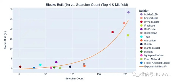 Titan 的研究指出,Builder 的市场份额与连接到他们的 Searcher 呈正相关关系,并且这个相关性通常是指数级别的。