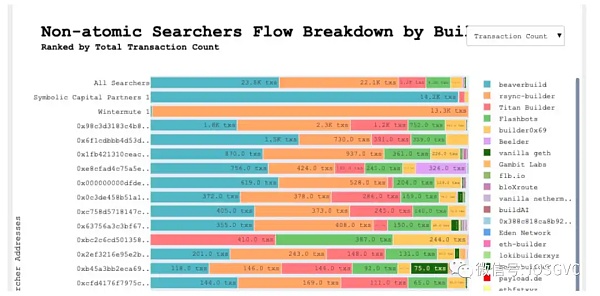 在 Atomic MEV 的情况下,我们可以看到所有 Searcher 基本上均匀地把他们的 Bundle 提交给前三的 Builder。然而在 Non-atomic MEV 的情况下,Titan 作为前三的 Builder,只拥有大概 8.8% 的订单流份额。在上图中我们可以看到显著的差别。这显示了来自垂直整合的 Searcher-builder 对订单流的独占访问。