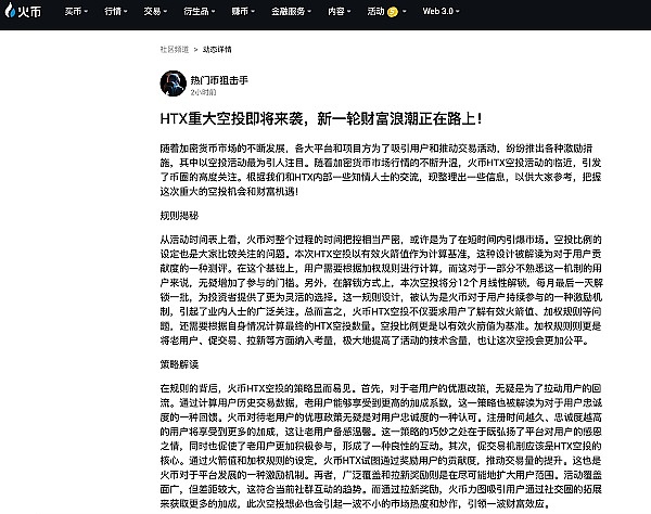 在规则的背后,火币HTX空投的策略显而易见。首先,对于老用户的优惠政策,无疑是为了拉动用户的回流。通过计算用户历史交易数据,老用户能够享受到更高的加成系数,这一策略也被解读为对于用户忠诚度的一种回馈。火币对待老用户的优惠政策无疑是对用户忠诚度的一种认可。注册时间越久、忠诚度越高的用户将享受到更多的加成,这让老用户备感温馨。这一策略的巧妙之处在于既弘扬了平台对用户的感恩之情,同时也促使了老用户更加积极参与,形成了一种良性的互动。其次,促交易机制应该是HTX空投的核心。通过火箭值和加权规则的设定,火币HTX试图通过奖励用户的贡献度,推动交易量的提升。这也是火币对于平台发展的一种激励机制。再者,广泛覆盖和拉新奖励则是在尽可能地扩大用户范围。活动覆盖面广,但差距较大,这符合当前社群互动的趋势。而通过拉新奖励,火币力图吸引用户通过社交圈的拓展来获取更多的加成,此次空投想必也会引起一波不小的市场热度和炒作,引领一波财富效应。
