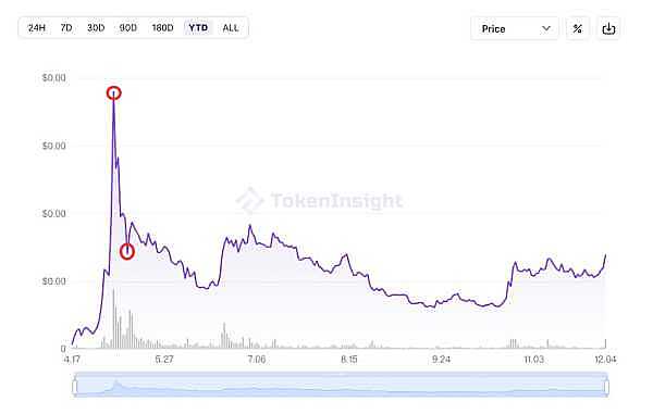 PEPE 的价格曾在一周内从最高点 $0.0000038 暴跌至 $0.0000014(2023.05.05 - 2023.05.11),跌幅约 63%。 根据当时的流通性供应量计算,受损市值约十亿美元。