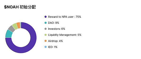 NOAH 是 Noahswap 的原生实用代币,它主要通过 NUSD 转换获得。根据 Noahswap 披露的通证分配计划,NOAH 初始供应量的 75% 将分配给 Noahswap 平台的流动性提供者作为奖励;15% 分配给投资者和团队。