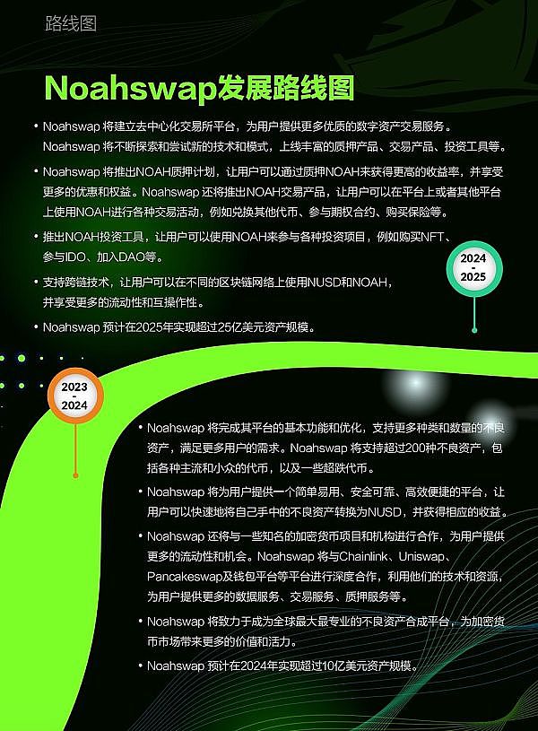 而从 Noahswap 披露的路线图也可以明显看出其对于长期发展的决心。Noahswap 2024-2025 的最终发展目标是建立一个功能完善、专注于不良资产交易的去中心化交易平台,成为亚洲自己的 Uniswap。