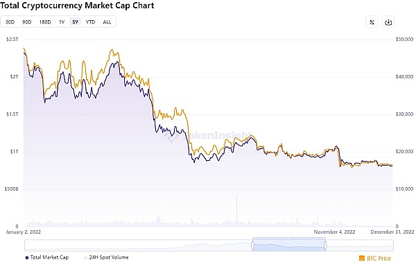 举例来说,2022 年初以 LUNA 事件为导火索带来的一系列破产和崩盘事件,引起了市场暴跌,使整个加密市场剧烈动荡。2022 年底加密市场总市值缩水为 8,290 亿美元,较年初减少了约 64%。