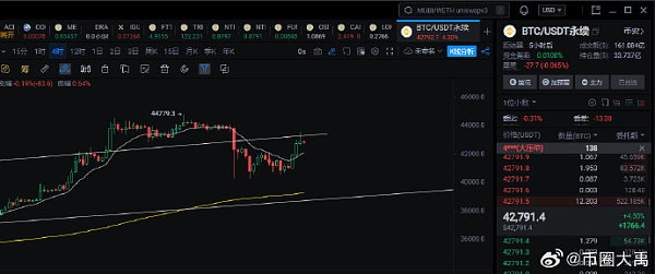 四小时线上,我们看到目前价格在上行通道遇到阻力后迅速回撤,可以在42300点位再次考虑上行。