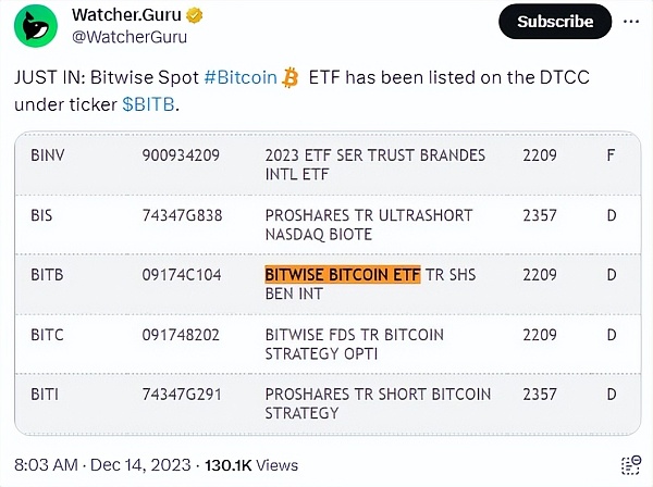 Watcher.Guru发推称,Bitwise比特币现货ETF近日在美国存款信托与清算公司(DTCC)下被正式列名,交易代码为BITB。此前,贝莱德与富达现货ETF皆已被列入,但这是正常经历的程序,不应被视为批准的任何信号。
